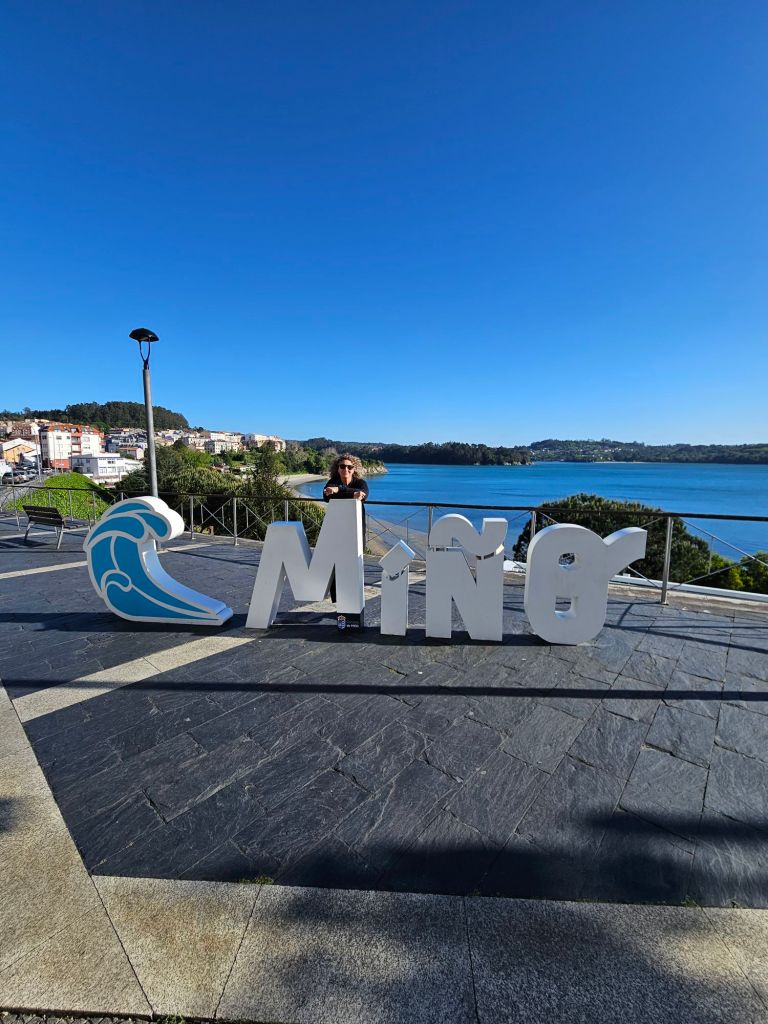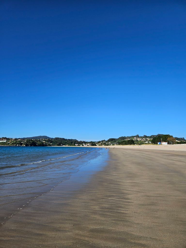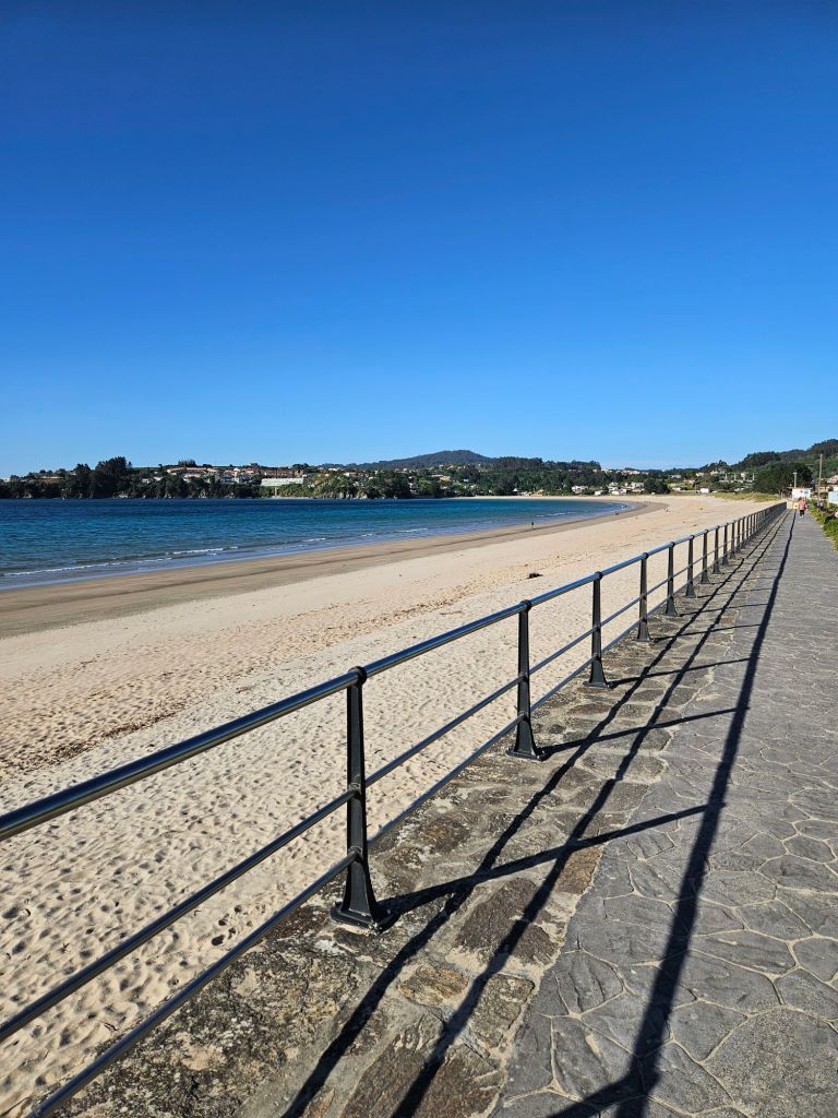 Finally we rolled into Miño, which turned out to be a lot bigger than I imagined. Our hotel would be near the beach and on the camino, but it was approaching the kitchen cut-off time so we sat down at a little eatery just 50m from the hotel and ordered a large salad and some raxo, marinated and pan fried pork cubes perfectly seasoned. Then on to the room, which is great with sea views, fabulous shower and a lovely hostess. And being the intrepid adventurers we are, we headed out post shower to find the beach!