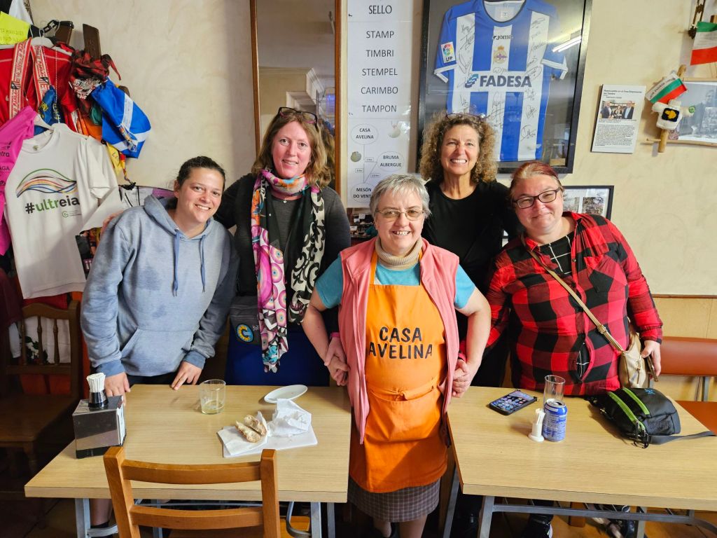 The hills rose gently towards the highest point for the day and then, less than a km later and just before the rain bucketed down – the legendary Casa Avelina. The lady running ot is an absolute star, so warm and caring to all who come in, offering little stools for tired legs, little sweet and/or savoury snacks for hungry walkers, fetching a hat stand to hang wet ponchos, posing for endless photos and making sure everyone in her bar are well cared for and feel at home.