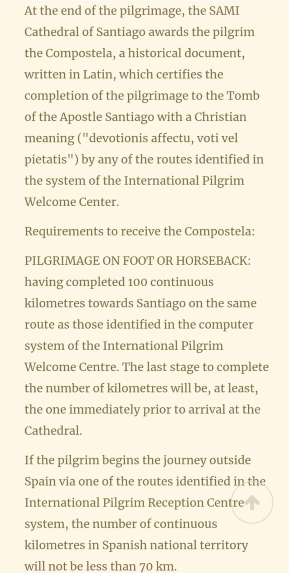 (edit: said, yesterday, 9. feb! Changed today, see new text below): Pilgrimage on foot or on horseback : having walked 100 km along any of the routes recognised as official by the SAMI Santiago Cathedral.