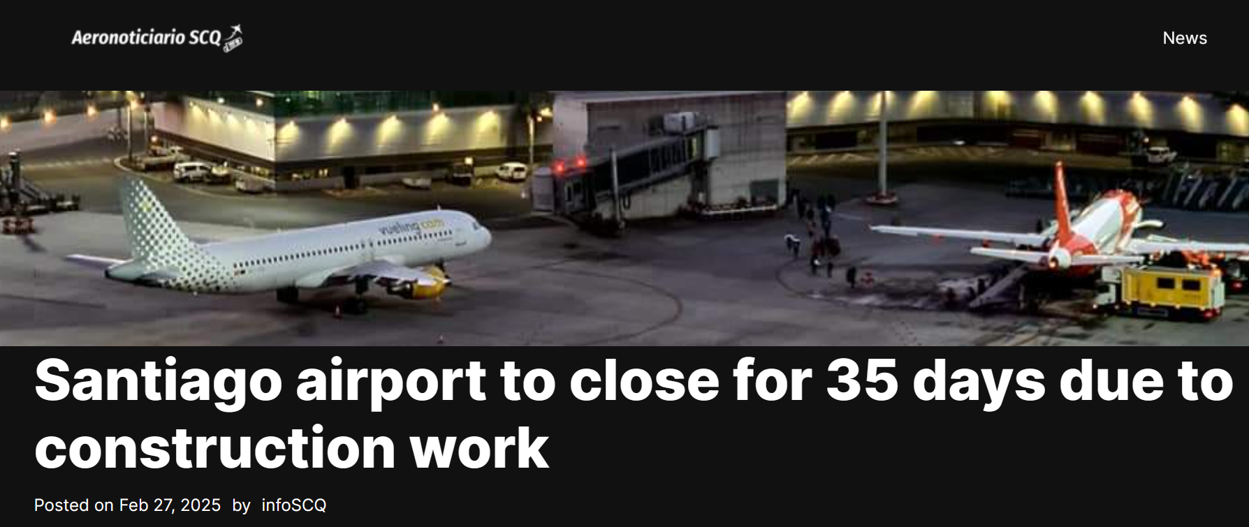 It is one of the largest interventions to be carried out since the construction of the passenger terminal and for this purpose the Santiago de Compostela airport will close for 35 days for works. It will be between April 23 and May 27 of next year, 2026, and as announced by the airport manager – Aena – it will be a total closure of activity and therefore no type of air traffic will be allowed to or from the Galician capital.