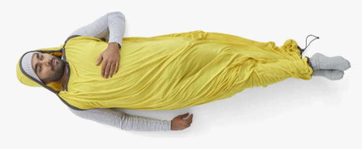 And then I saw this: A Sea to Summit Breeze knitted cool-max liner (they also have a warmer version, Reactor) with the same cinch opening at the bottom and even buttons on the “shoulders” – I imagine you could stick your legs out, hoik the bag up and go to the loo without even fighting your way out of and back into the liner!