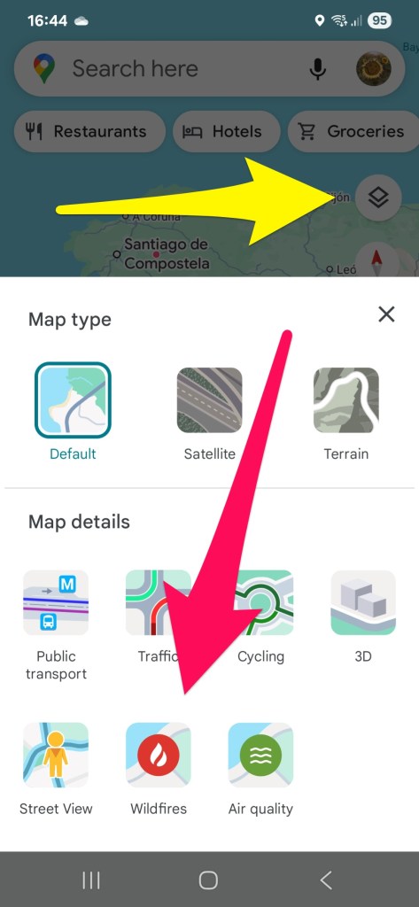 If you open Google Maps, pick a location you are interested in, then click on Layers – the little stack of squares marked by the yellow arrow in the first screenshot below. Then choose the information layer with Wildfire, marked by the red arrow. You’ll get the wildfire information added to the other info on the map.